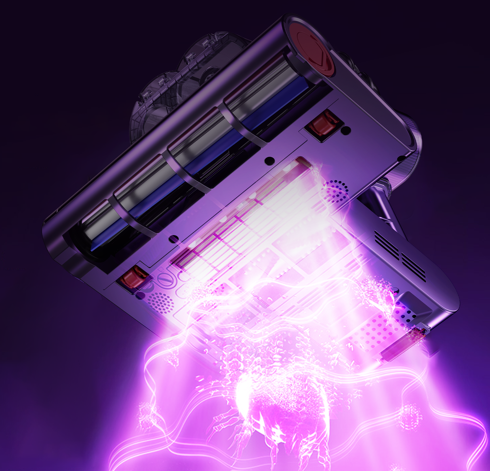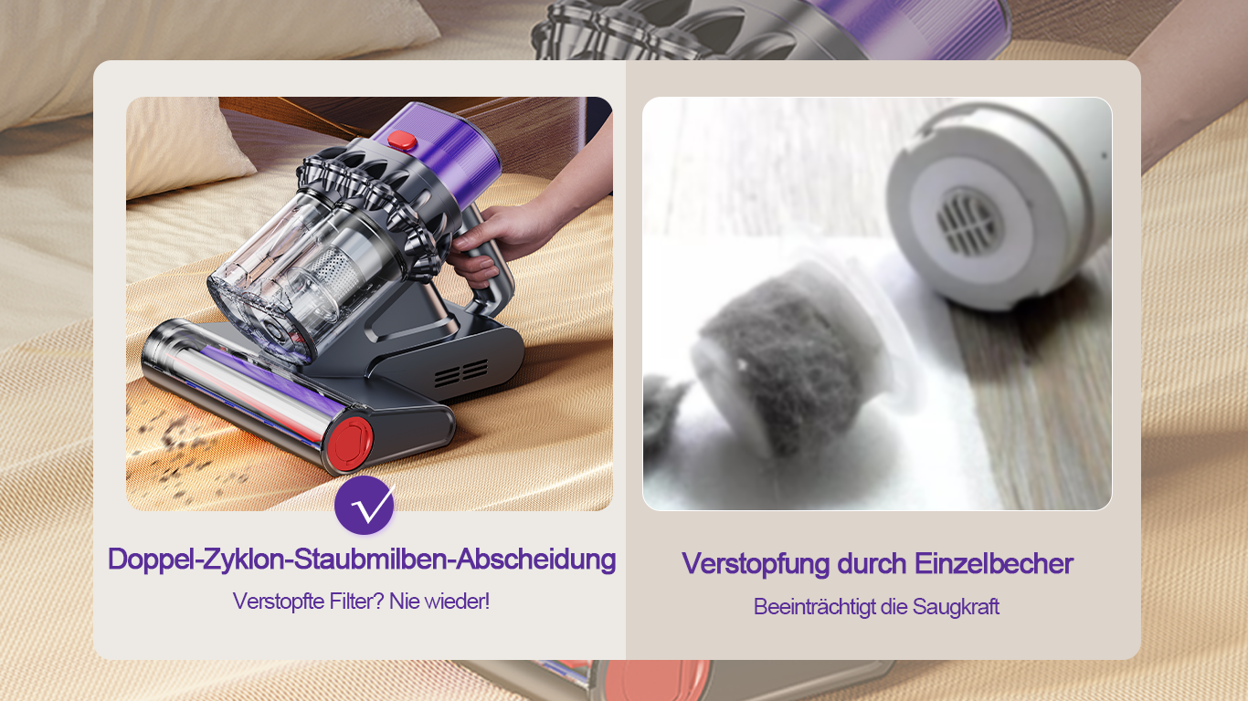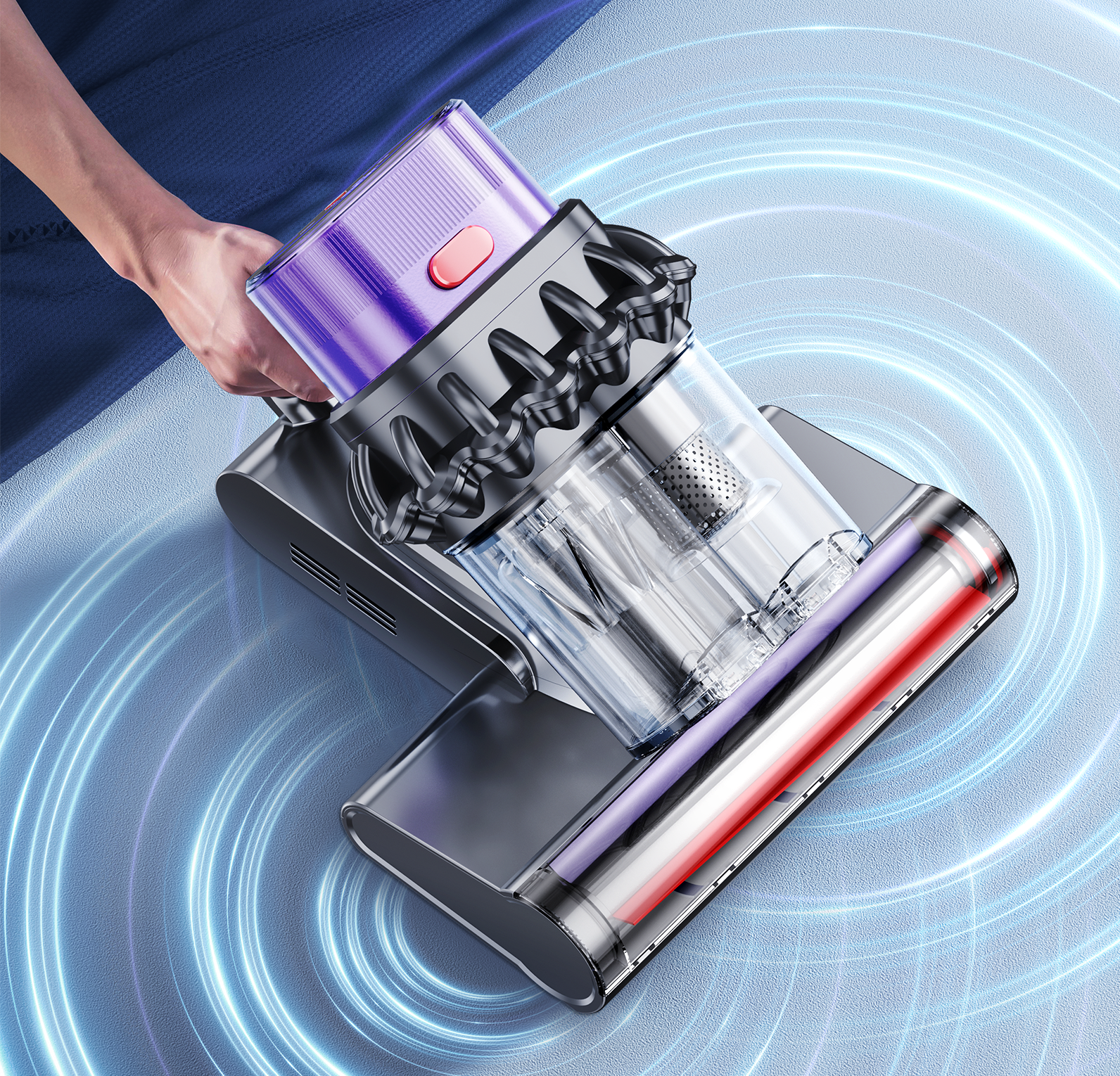 Fünf-Kegel-Luftstrom-Technologie für verstärkte Saugwirkung + drei Motoren mit ultraschnellen bürstenlosen Motoren + ursprüngliche T-Beat oszillierende Hochfrequenz- "Schnappsaug"-Funktion (schnelle Saugfunktion) + upgradeder vierfache Saugkanal für herausragende Tiefenreinigung und Milbenabtötung mit einer Bakterien- und Milbenabtötungsrate von 99,99 %.